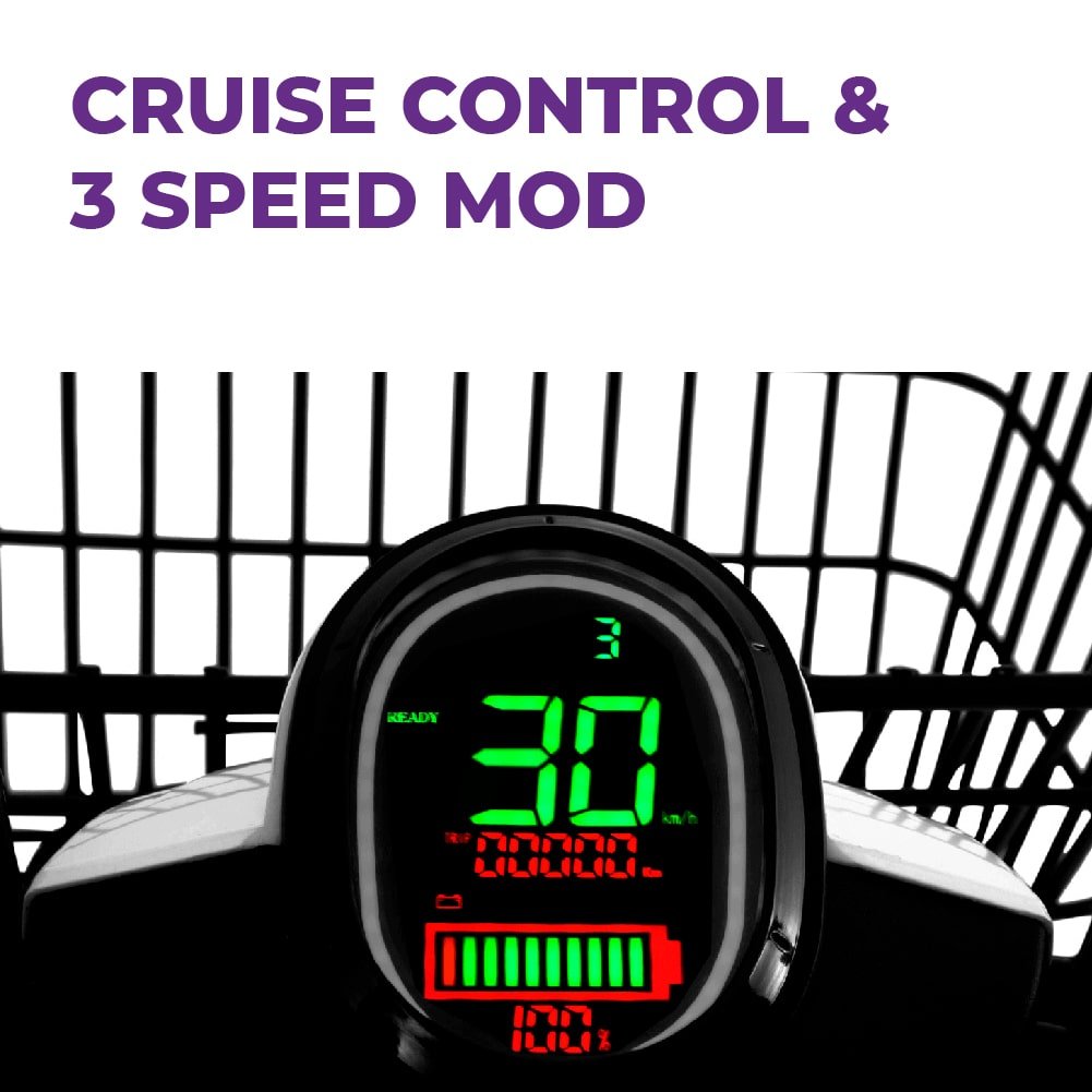 Cargoo puede circular hasta un máximo de 45 Km/h, coincidiendo justamente con la velocidad máxima permitida para los vehículos matriculados como ciclomotor en España. Dispone de 3 velocidades, luces de posición, corta y larga, así como claxon en su mando de control ubicado en sus puños.