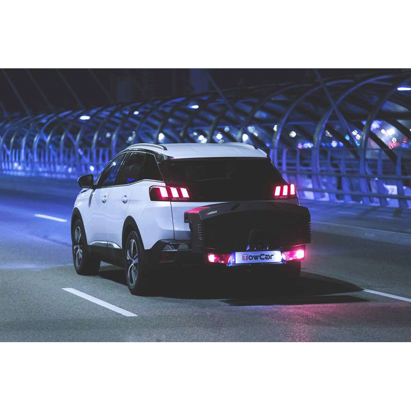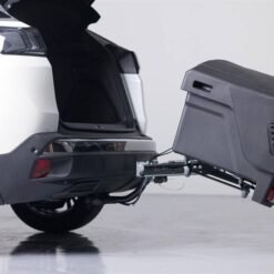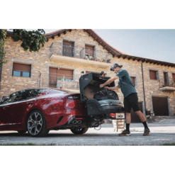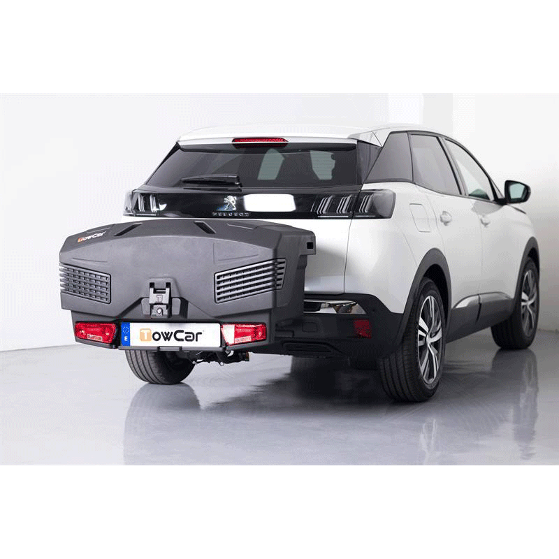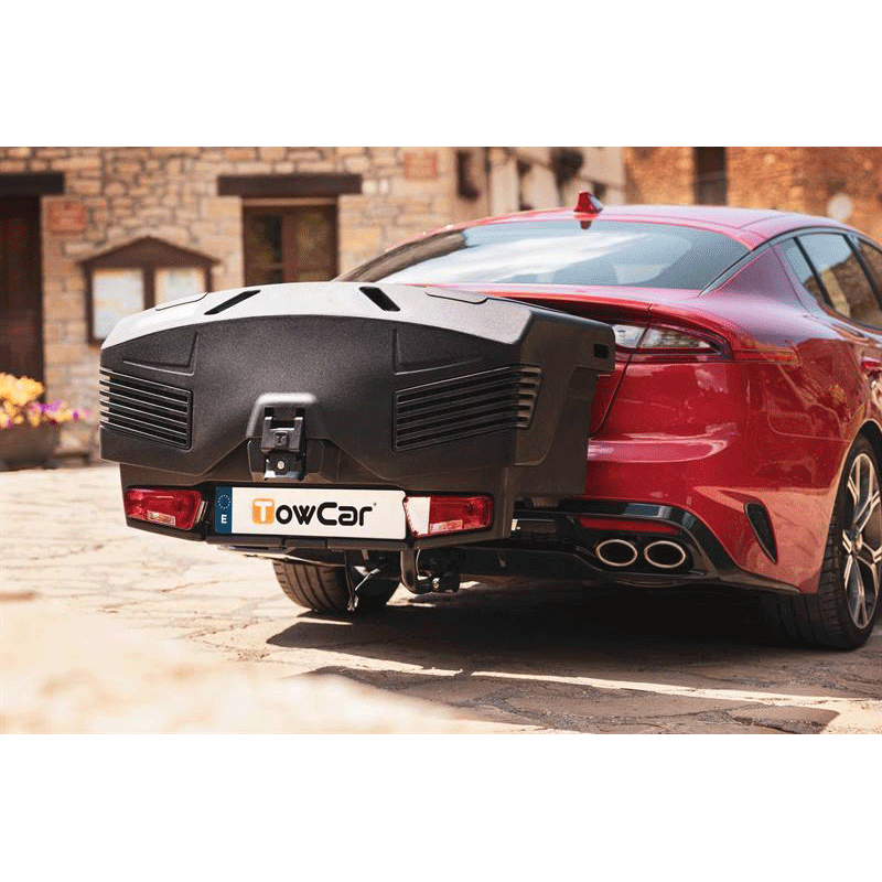 El TowBox Evo es mas moderno, mas reducido e igual de funcional que otros portaequipajes TowBox. Es abatible, incluso cuando está cargado. Va colocado sobre la bola de enganche del vehículo. Lleva ruedas integradas tipo trolley para facilitar su transporte cuando no están colocados sobre la bola de enganche del vehículo.