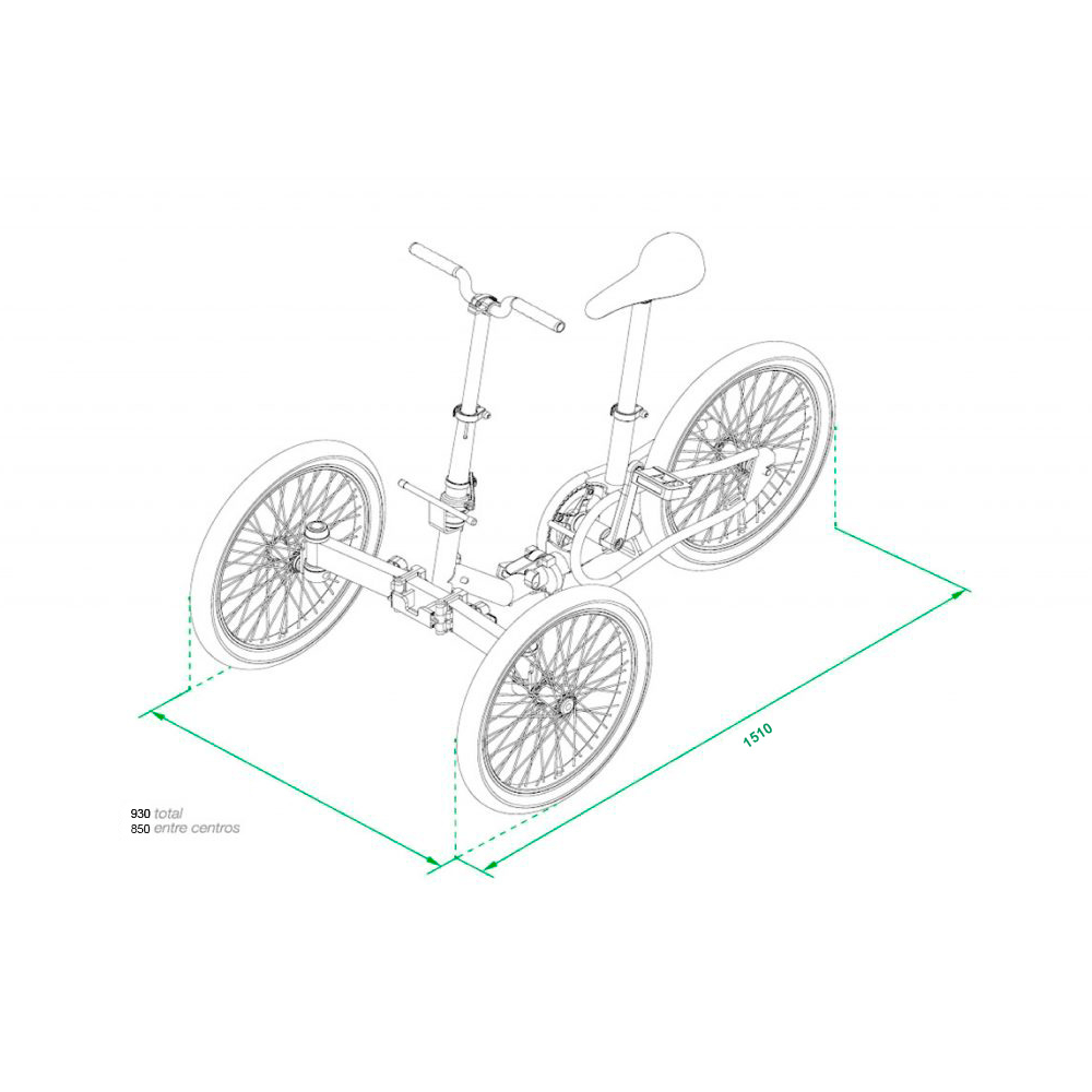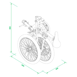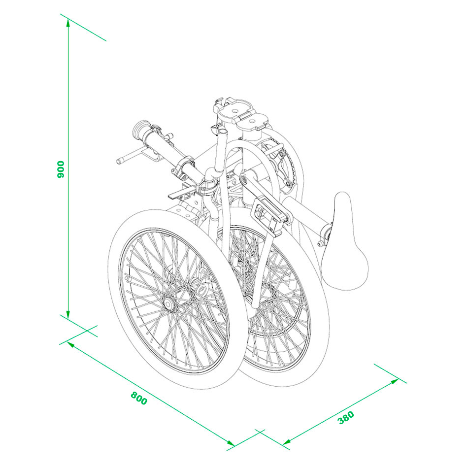 Las medidas del triciclo plegado son de 90x80x38cm, ocupando un 75% menos que al inicio.